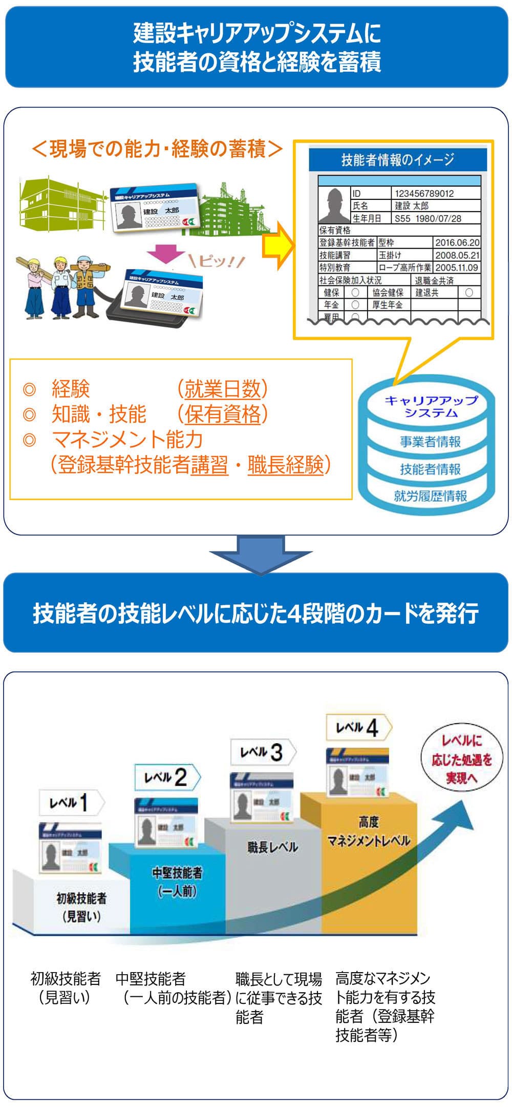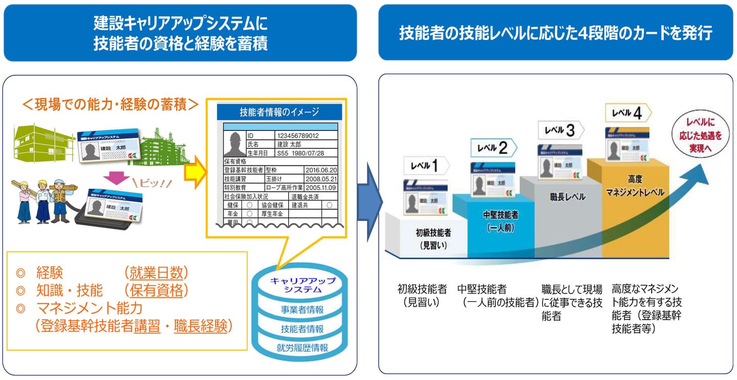 技能者1人ひとりの就業日数や保有資格、研修受講、表彰などの履歴を登録・蓄積し「見える化」する仕組みです。